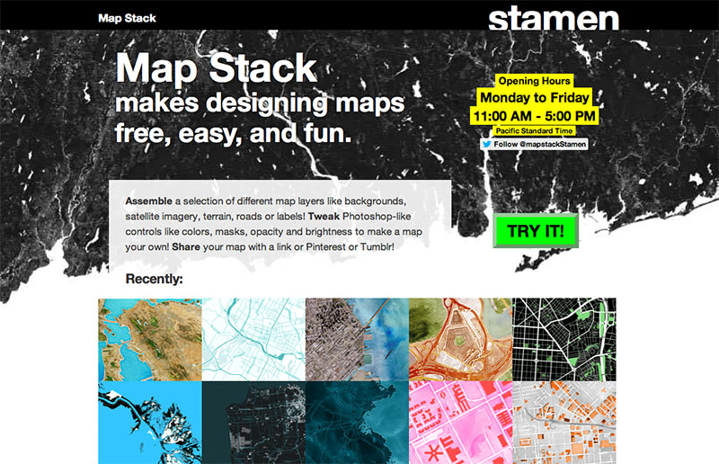 # Map Stack 2013 for Stamen (read more) Map Stack is an interactive web application for mixing together tiled map styles from Stamen, MapBox, and other sources. Roles concept development interface design front-end implementation Tools JavaScript D3 Leaflet Bootstrap Sando
